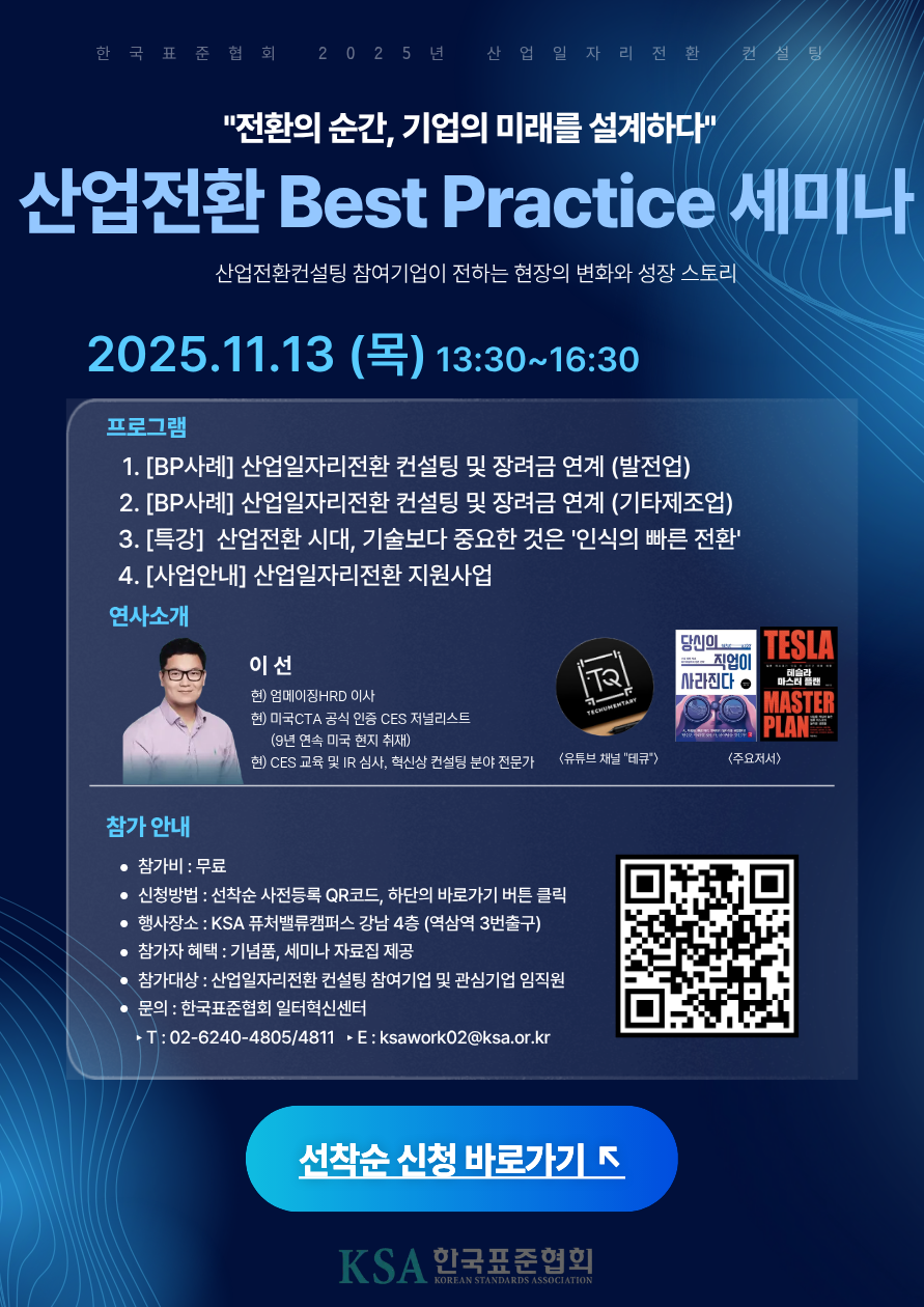 한국표준협회는 산업구조 변화와 기술혁신 가속화에 대응하기 위해 기업의 산업전환 대응 역량 강화를 지원하는 세미나를 개최하고자 합니다.