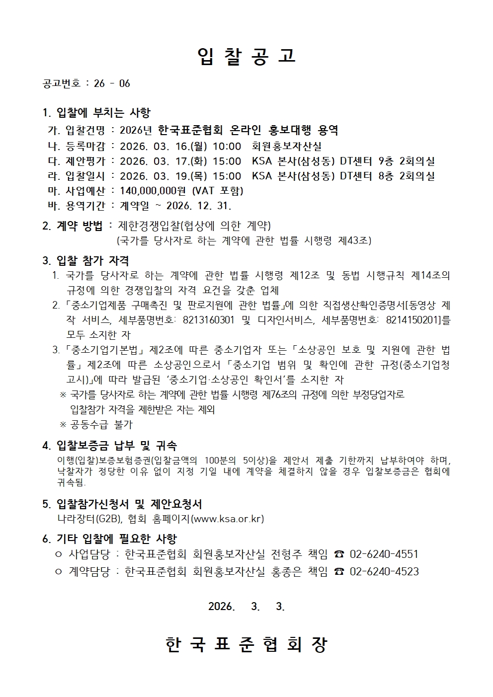 [입찰공고]한국표준협회 SNS 콘텐츠 및 홍보 영상 제작 용역