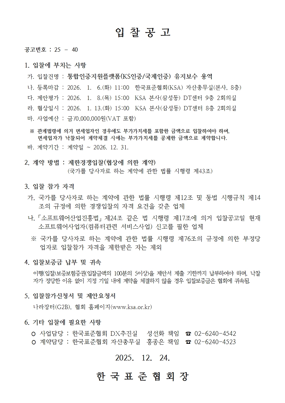 [입찰공고]통합인증지원플랫폼(KS인증/국제인증) 유지보수 용역